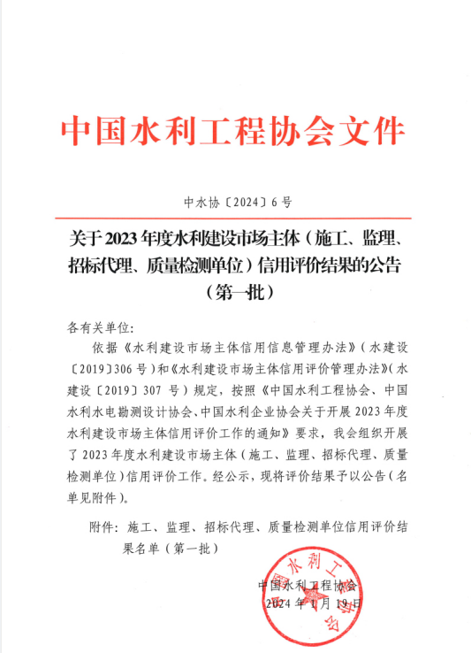 近日,中國水利工程協(xié)會《關于2023年度水利建設市場主體(施工、監(jiān)理、招標代理、質(zhì)量檢測單位)信用評價結(jié)果的公告(第一批)》(中水協(xié)〔2024〕6號)、中國水利水電勘測設計協(xié)會《關于2023年度水利建設市場主體(勘察、設計、咨詢單位)信用評價結(jié)果的公告》(中水協(xié)秘〔2024〕6號)、《關于2023年度全國水利水電勘測設計行業(yè)信用評價結(jié)果的公告》(中水協(xié)秘〔2024〕7號)發(fā)布。