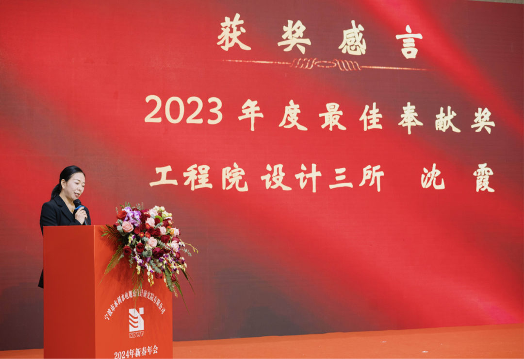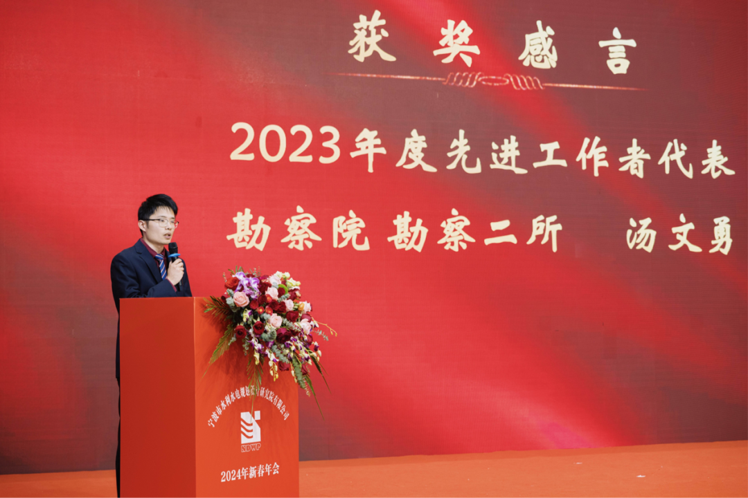 2023年度先進工作者獲獎代表勘察院勘察二所的湯文勇、2023年度最佳奉獻獎獲獎者工程院設計三所的沈霞、2023年度最佳新人獎獲獎代表規(guī)劃院規(guī)劃二所的魯經(jīng)宇,先后上臺發(fā)表獲獎感言,以真摯的情感、質(zhì)樸的語言和滿滿的憧憬,表達了自己與企業(yè)共同成長過程中的勵志故事和切身感悟,表達了寧波院中堅力量、團隊骨干和新兵后輩的豪情壯志。